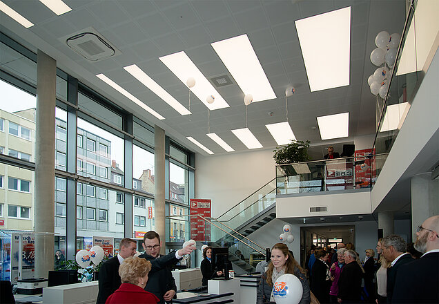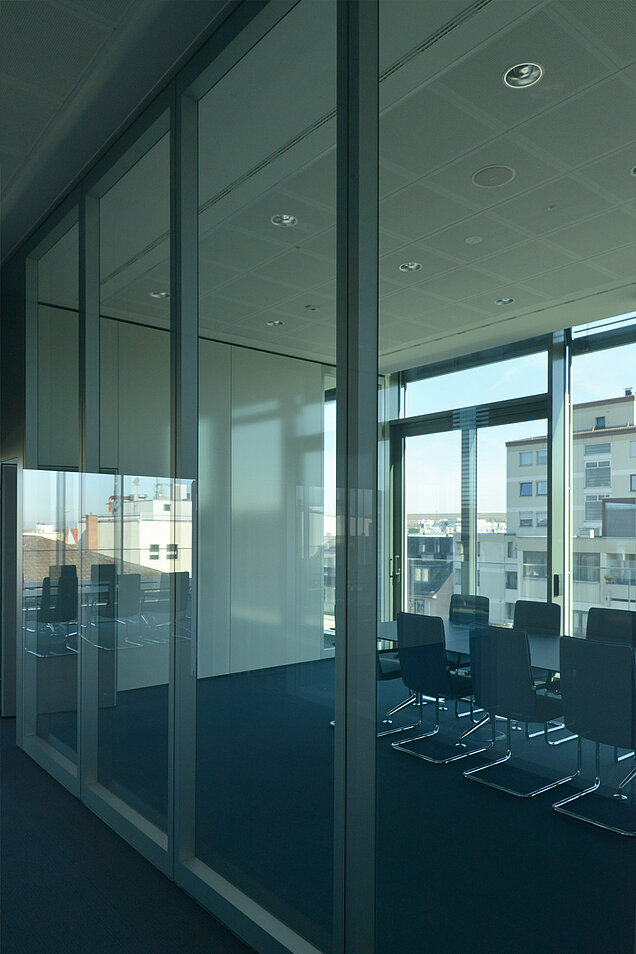 Im Erdgeschoss entstand eine großzügige Kundenhalle mit einem modernen Selbstbedienungsbereich. In den Obergeschossen des 1. bis 3. Stocks wurden komfortable und funktionale Beratungsplätze eingerichtet. Das 4. Obergeschoss erhielt eine zurückgesetzte Saalebene mit markantem Erker sowie Pausen- und Besprechungsräumen.